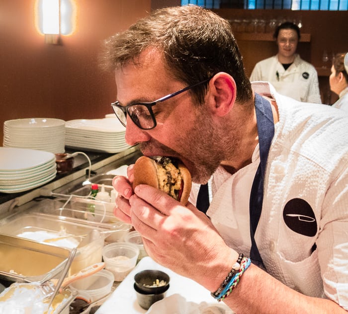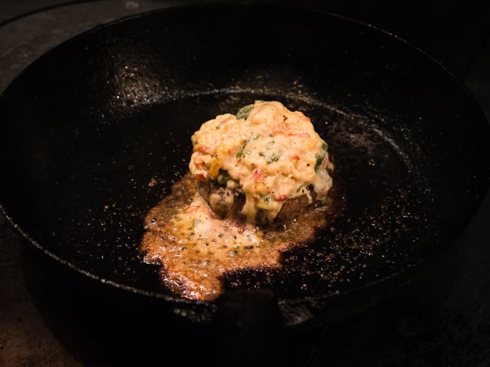 That, my friends, is burger pan sauce. Very French. Very American. Very Cheffy. We snuck into the kitchen of Knife and caught John Tesar working his magic on a burger with poblano-spiked pimento cheese.