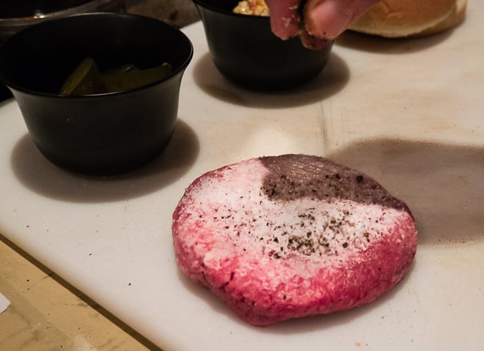 - Salt and pepper your burgers on one side, letting the seasonings fall on the patties like rain