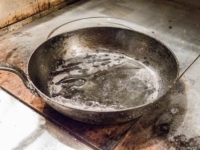 - get a pan smoking hot, then add a little canola oil or clarified butter to the pan before you add the beef. That’ll keep the burger from sticking and help develop a crispy, crunchy crust.