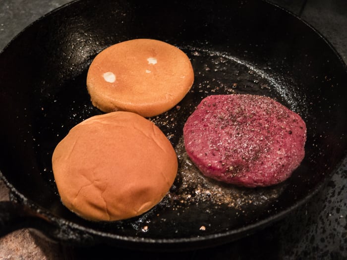 - while the first side of the burger gets a sear, add a bun to the pan to brown the toast it. It’ll be ready in about a minute.