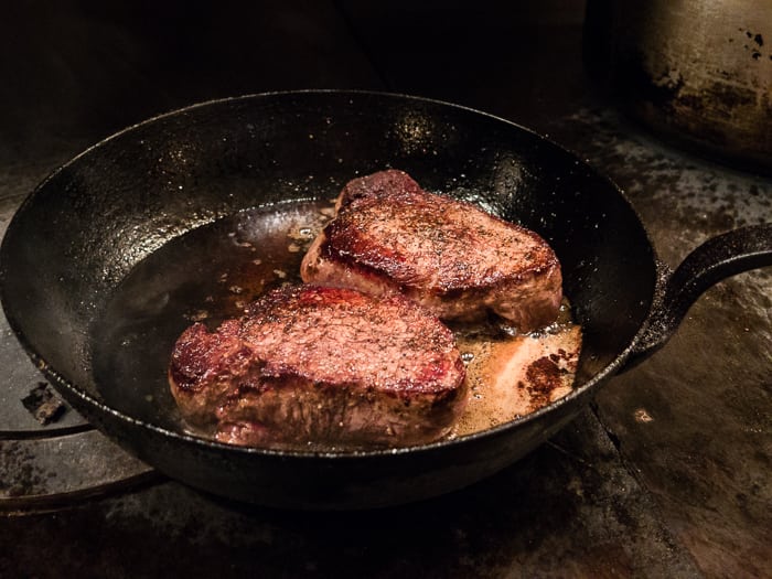 - While your burger cooks, check on the steaks cooking in the pan next to it. You have steaks cooking in the pan next to the burgers, right?