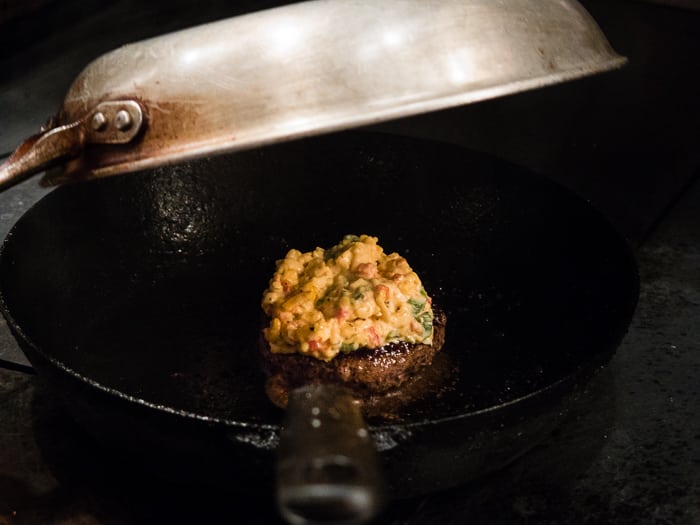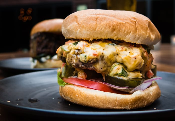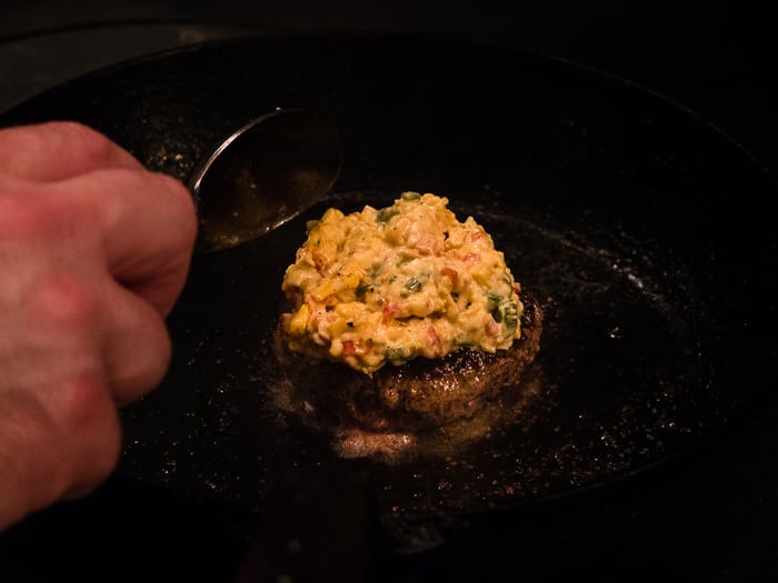 - spoon the pimento cheese onto the top of the burger right after you flipped the burger. As the uncooked side of the burger cooks, the cheese will go all gooey on the top side.